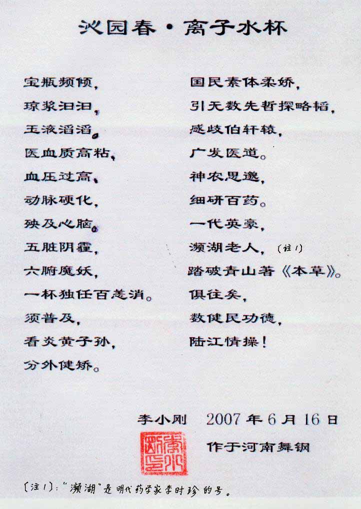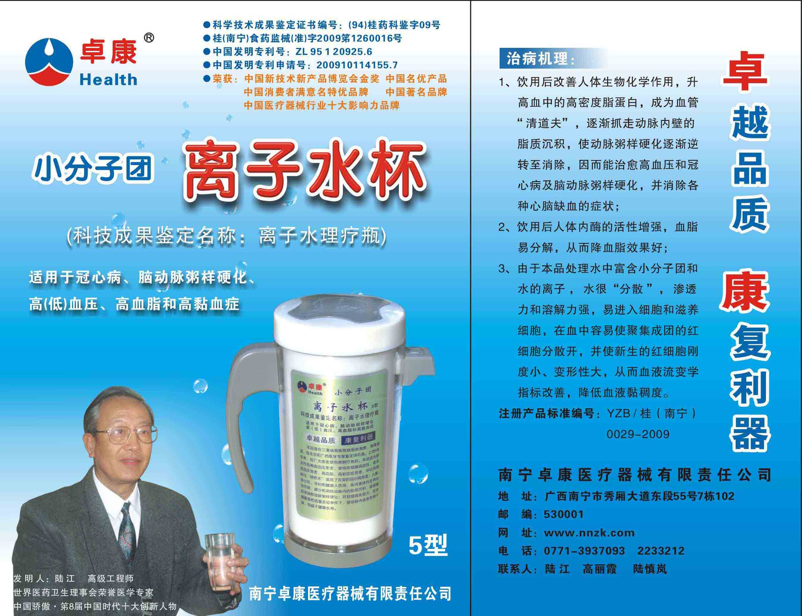 -----我是從事建筑的高工,本來沒有資格去攻克醫(yī)學(xué)難題,卻為了自身健康才扣響醫(yī)學(xué)的大門。由于我1990年患高血壓,因怕中風(fēng)才研究發(fā)明了離子水瓶,我把水處理成微小分子團(tuán)水,飲用后治愈了高血壓。便于1993年底送到三家省級醫(yī)院做臨床試用4個月。經(jīng)北京和廣西醫(yī)學(xué)專家鑒定:"降脂降壓效果好"," 能擴(kuò)大心腦動脈流量,改善心腦電圖以及微循環(huán)","對治療心腦動脈粥樣硬化、高血壓、高血脂有良好的醫(yī)療保健作用。""產(chǎn)品的技術(shù)性能和療效達(dá)到了同類產(chǎn)品的國內(nèi)領(lǐng)先水平,經(jīng)廣西醫(yī)學(xué)科學(xué)情報研究所檢索,未見國外有類似報道。"中國醫(yī)學(xué)科學(xué)院張正國教授從美國國立醫(yī)學(xué)圖書館數(shù)據(jù)庫存Medline檢索英俄文資料,均未見類似報告。2000年上市后,我為了對消費(fèi)者負(fù)責(zé)而繼續(xù)觀察研究,一直通過《信譽(yù)卡》和《質(zhì)量跟蹤調(diào)查書》向患者承諾療效,請用戶使用6個月后反饋效果。和脂壓患者飲用2至5個月內(nèi),消除癥狀,停服藥物,血壓正常;冠心病患者飲用3~5個月逐漸減輕至消除心絞痛、房顫等癥狀,不再服藥,飲用1年左右心電圖正常,經(jīng)冠脈造影掃描無明顯狹窄,表明冠心病痊愈。大量患者還反映許多衰弱器官被修復(fù),讓前列腺增生、慢性咽喉炎、慢性氣管炎、支氣管炎、慢性胃炎、腸炎和膽囊炎等不藥而愈;2型糖尿病患者是因?yàn)橐葝u衰弱致病,飲用該水半年至一年,逐漸減藥至停藥,血糖尿糖正常,真正治愈2型糖尿病。中風(fēng)后遺癥患者飲用六七個月,可逐漸減輕至消除肢體和語言障礙,表明飲用該水能讓壽命很長的神經(jīng)元細(xì)胞逐漸修復(fù),奇跡般地恢復(fù)肢體和語言功能。飲用后還使胸腺和脾臟兩個重要的免疫器官被修復(fù)和增強(qiáng),產(chǎn)生免疫細(xì)胞多,提高了免疫力,使人不生病或少生病。自此, 飲用微小分子團(tuán)水創(chuàng)造了攻克冠心病、高(低)血壓和糖尿病三大醫(yī)學(xué)難題的奇跡。人們對此感到不可思議,但實(shí)踐是檢驗(yàn)真理的唯一標(biāo)準(zhǔn)。