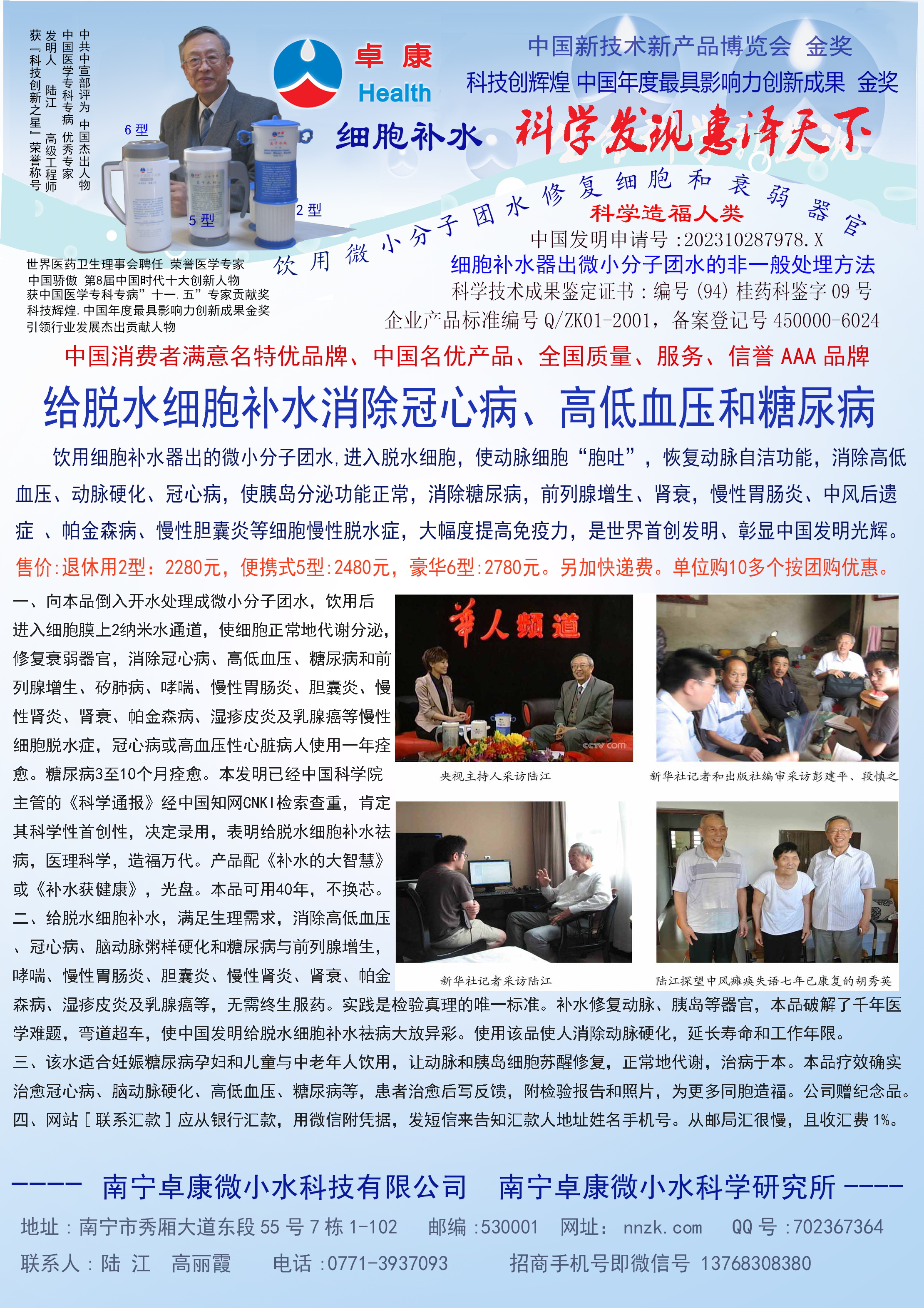 - -- 幾千年來,人類靠醫(yī)藥不能根治冠心病、高血壓和糖尿病,如想根治,那是夢想。可是,我從中國基礎(chǔ)醫(yī)學(xué)研究成果受到啟發(fā),研發(fā)了一種發(fā)明產(chǎn)品,處理出微小分子團(tuán)水讓人飲用,實(shí)現(xiàn)了人類這一夢想!患者飲用后遠(yuǎn)離了冠心病、高血壓和2型糖尿病。這一成果曾經(jīng)過臨床試用和專家鑒定,作為準(zhǔn)字號醫(yī)療器械讓廣大患者飲用,療效進(jìn)行跟蹤調(diào)查。很多患者的反饋情況令人感動,我放在公司網(wǎng)站上(nnzk.com),震撼了醫(yī)學(xué)專家,也使廣大同胞受到啟發(fā)。人們盼望飲用它給細(xì)胞補(bǔ)水,治愈多種病癥,既省錢,又安全,而且延長壽命。